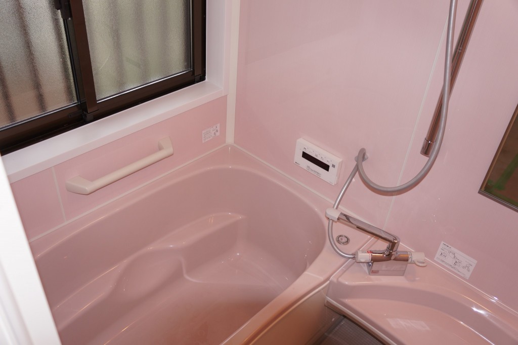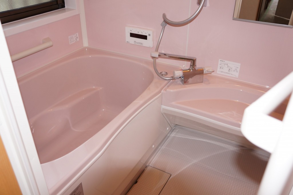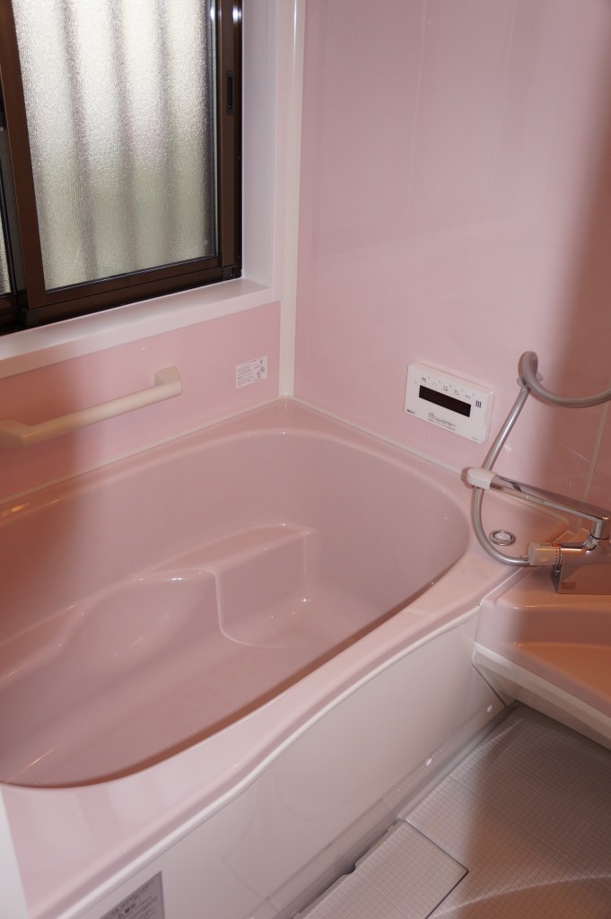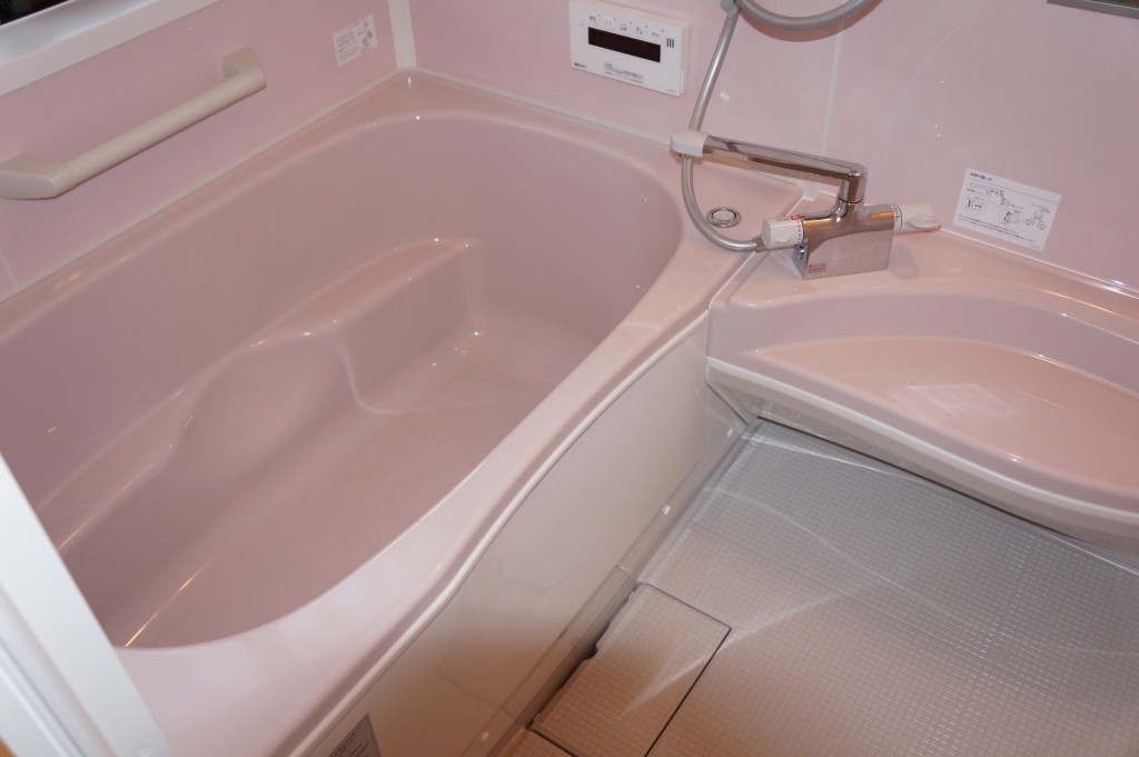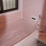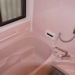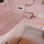 ノーリツのリズは浴槽が広々タイプです。 お色も淡いピンクで温かな雰囲気です。 タイルはカビや水あかのお掃除が大変ですが、 システムバスはお手入れが楽々です。気持ちよいバス空間へ・・・