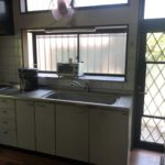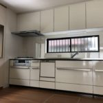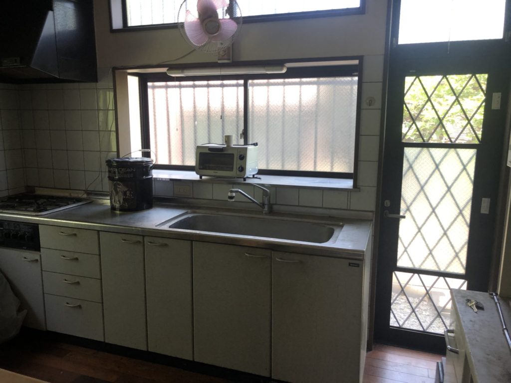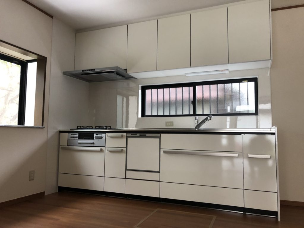 勝手口ドアを取り、冷蔵庫置き場を作り、とても掃除のしやすい新しいキッチンにすると同時に、床、天井、壁も改修しました。