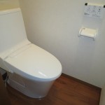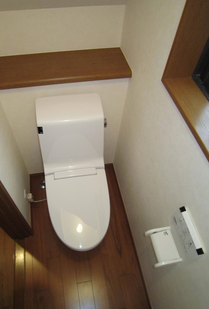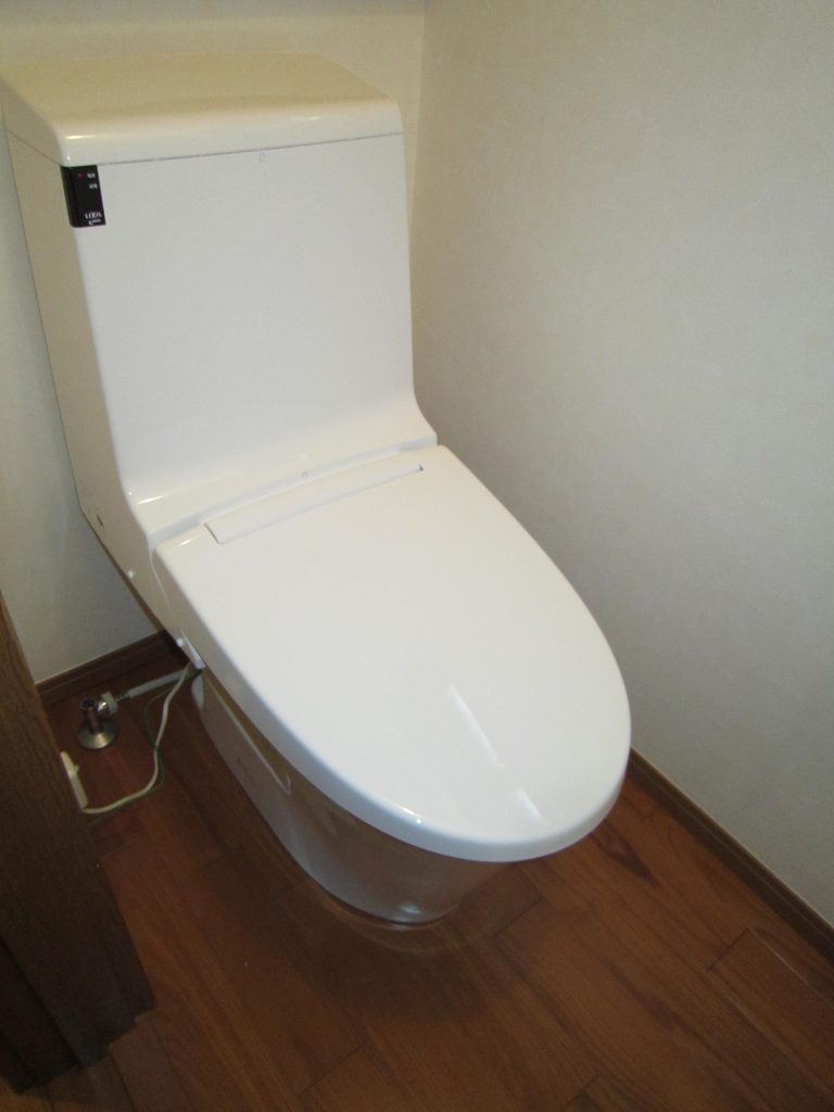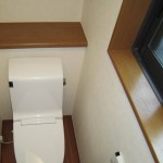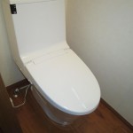トイレの本体に加えて床とクロスの貼替えも行ない、トイレをそっくりリフォーム 便器はシャープで足元がスリム形状ですので、 汚れも拭きやすく、お手入れカンタンです。 トイレ全体がすっきりして気持ち良いですね