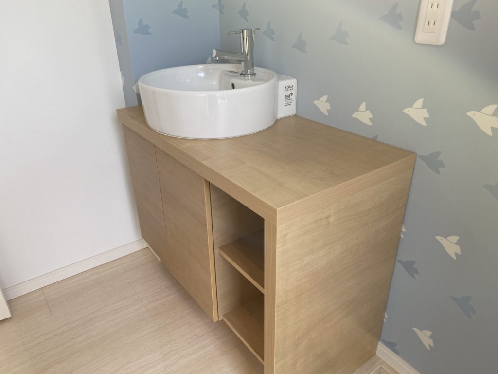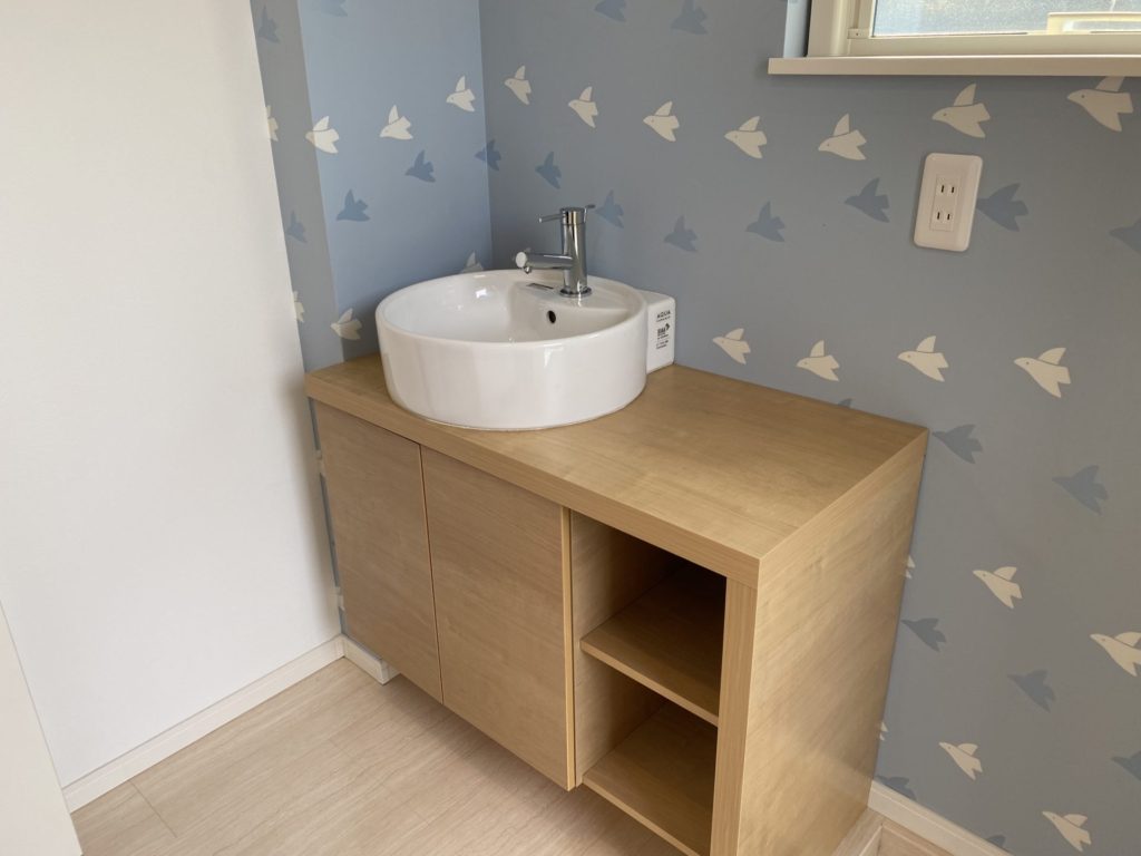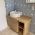 コロナ禍で、帰宅したらすぐ手を洗いたいとのご要望で、玄関収納を撤去し、水回りを作りました。 玄関とあって、おしゃれな手洗い器にしました。 クロスもおしゃれに張替えました。
