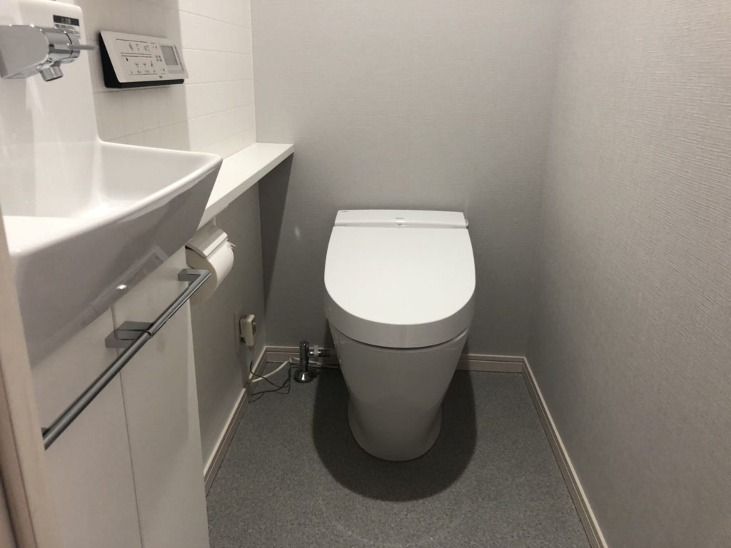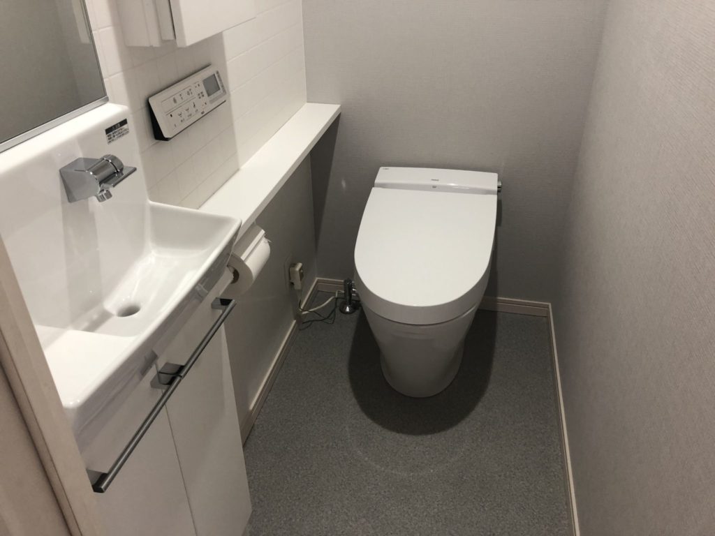 手洗い付きのトイレから、タンクレストイレと壁の手洗い器に変更。 とてもゴージャスな仕上がりで、お客さまも満足していらっしゃいました。