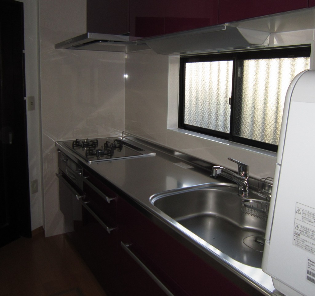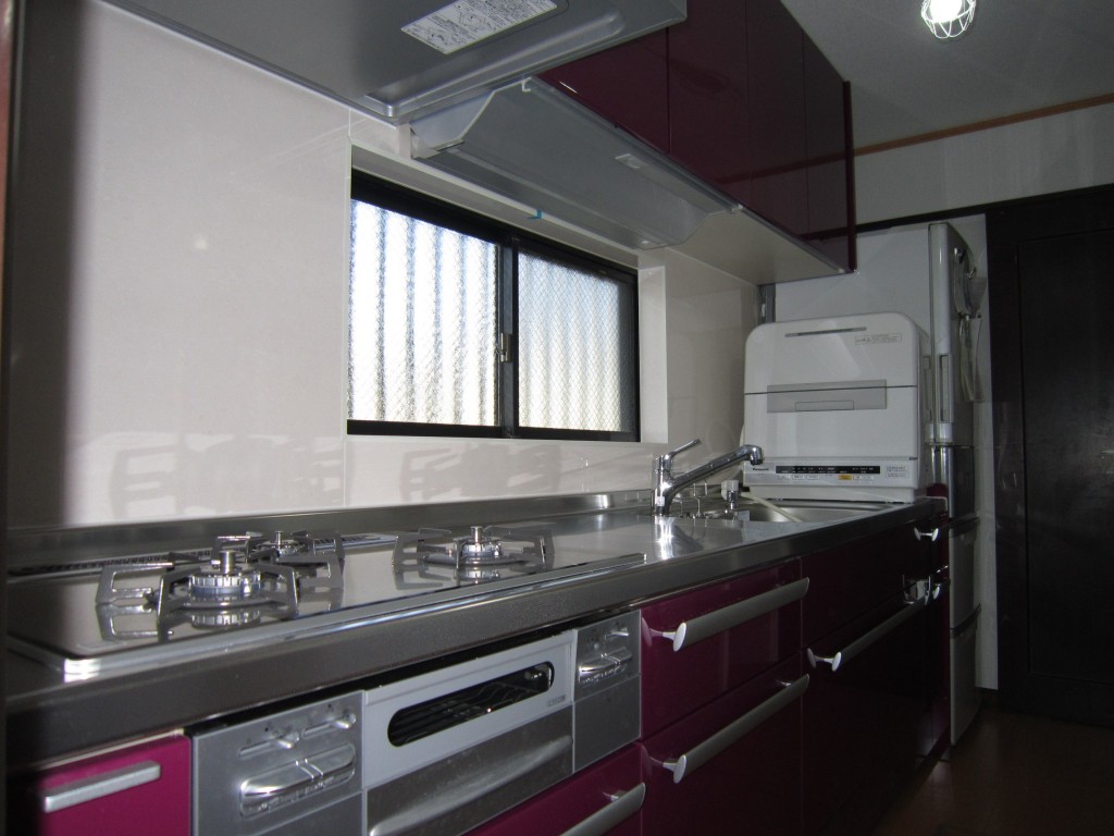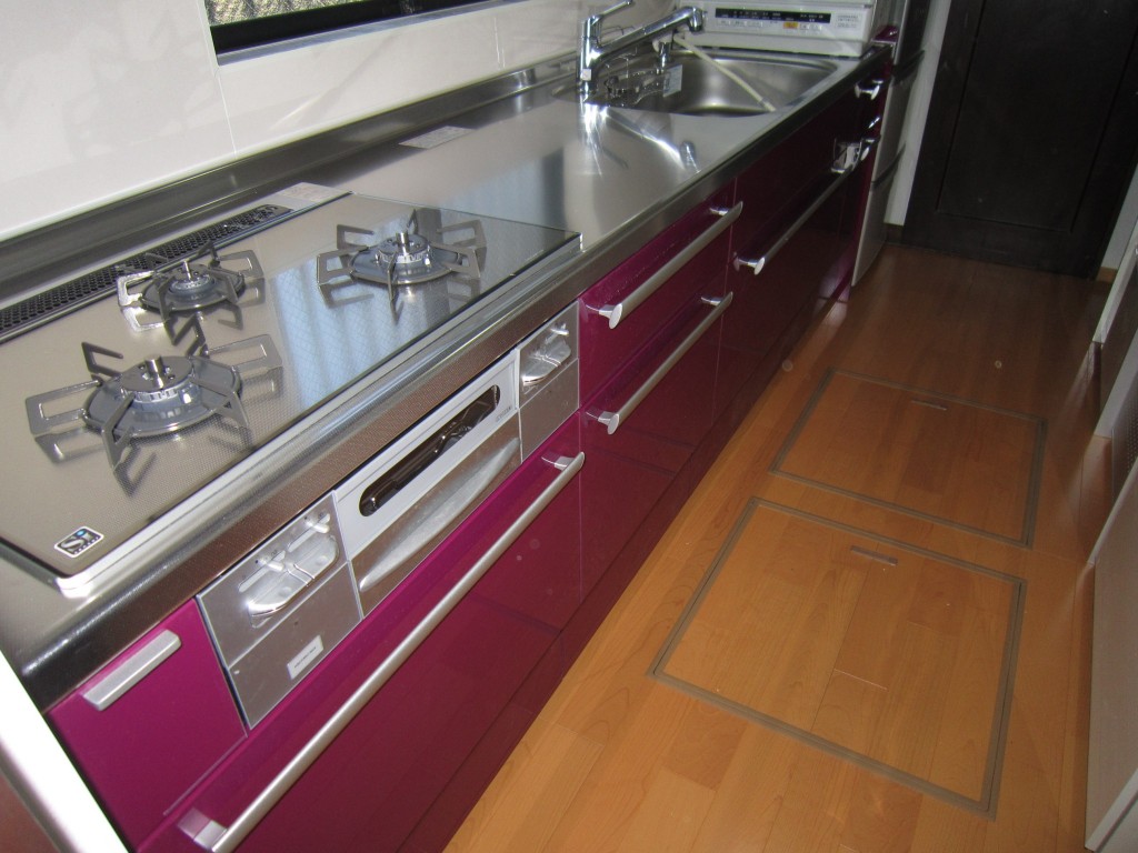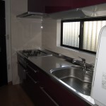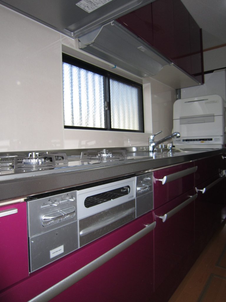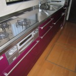 システムキッチンのお色はワインレッドで、設置してみるととても落ち着いたキッチンの雰囲気になりましたね。